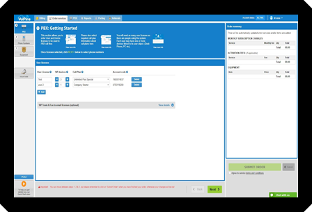 The image shown below is an example of the type of web-based portal available to manage the ordering and changes of services from a hosted pbx system. A few clicks are all that is required to place the orders and configure your services, eliminating the issues previously faced with onsite PBX’s that would require third-party involvement from a line provider and maintenance provider.