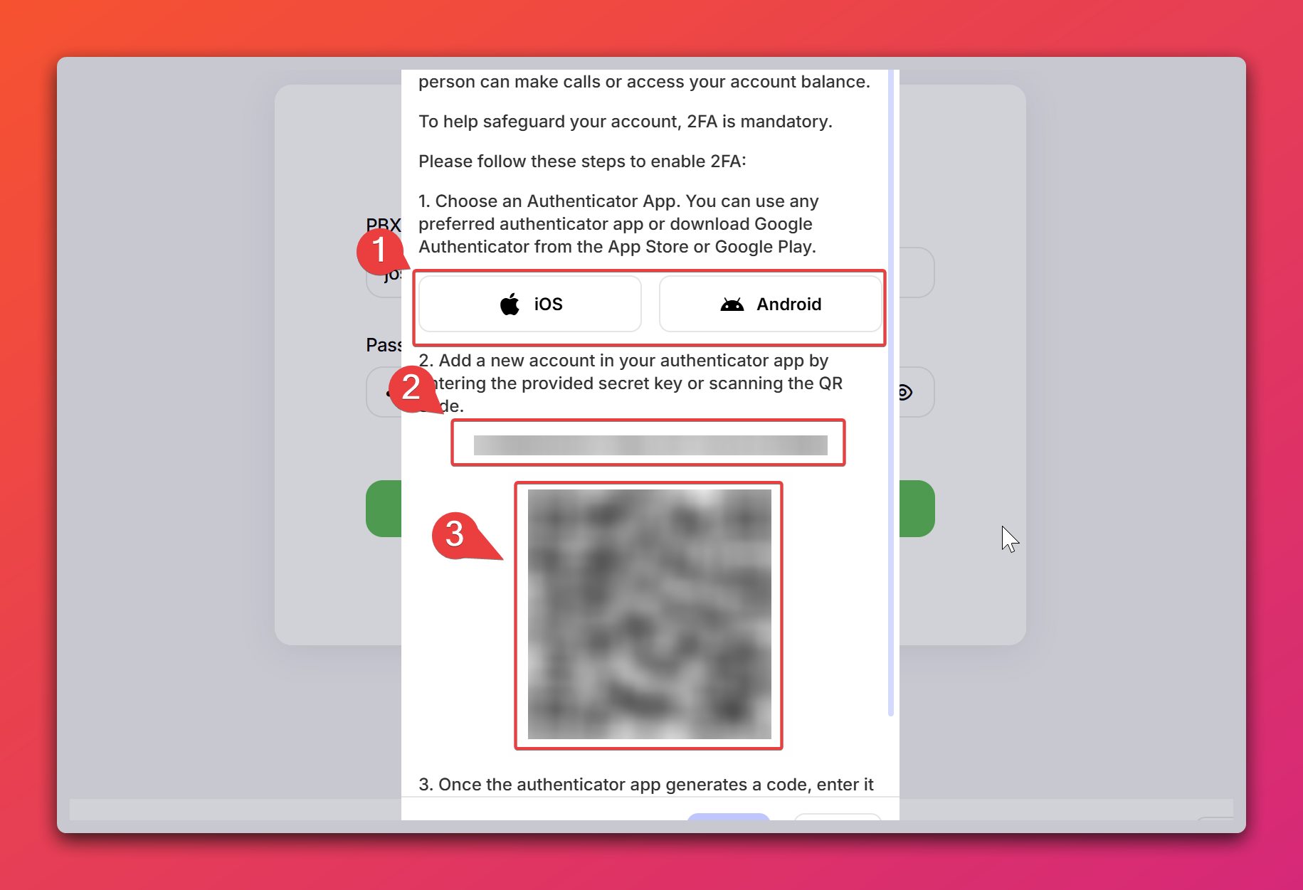 When you first login to the webphone you will be prompted to set up 2-Factor Authentication (2FA) with a mobile authenticator app. This is required for the security of your account.